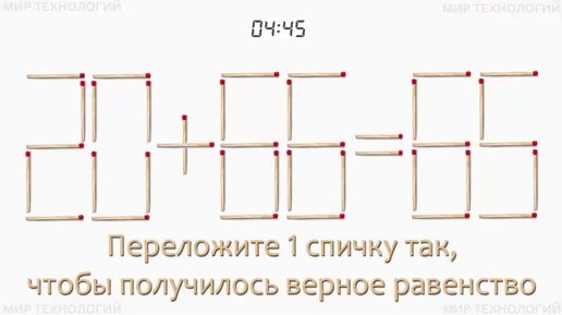 Задача 431. Переложите 1 спичку так, чтобы получилось верное равенство (20+66=65). Задачи и головоломки со спичками.