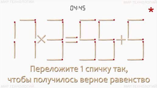 Задача со спичками 433 (2). Переложите 1 спичку так, чтобы получилось верное равенство (17 х 3 = 55 + 5)