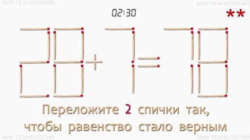 Задача 434 (3). Переложите 2 спички так, чтобы равенство стало верным (28+7=78).