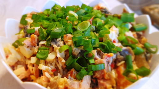 Вариант салата с крабовыми палочками для любителей курятины. Готовится салат с курицей и крабовыми палочками просто.