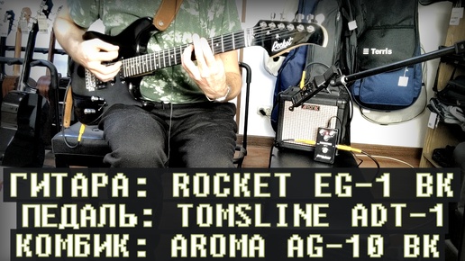 Электрогитара Rocket EG-1, педаль distortion Tomsline ADT-1, комбик Aroma AG-10 BK.