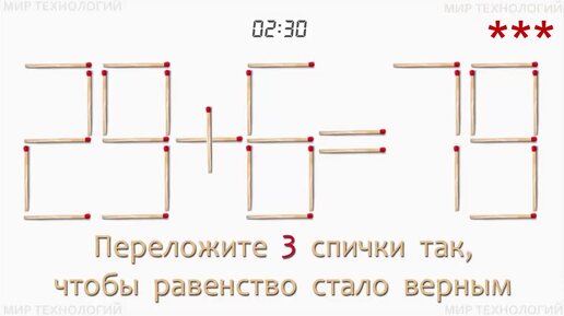 Задача со спичками 433 (4). Переложите 3 спички так, чтобы равенство стало верным (29+6=79)