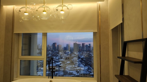 Белые рулонные шторы на окна, с эффектом односторонней видимости, для обеспечения приватности в ванной комнате. Современный декор окна.