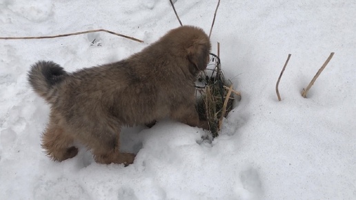 Прогулка «в кайф» с малышкой тибетского мастифа. Нашли вкусную палочку в снегу.