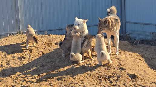 Щенки и лайки на песке