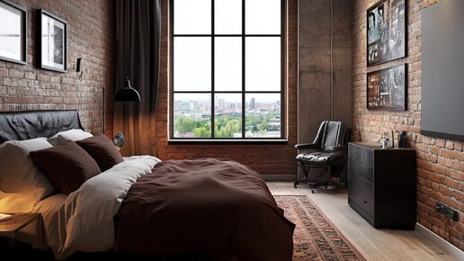 Спальня в стиле лофт с высокими потолками и стеной из клинкерного кирпича