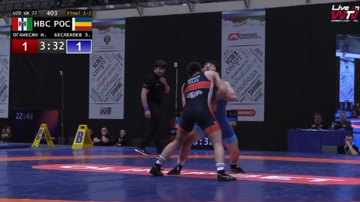 Осетинский борец Заур Беслекоев в упорной борьбе побеждает Нарека Оганесяна