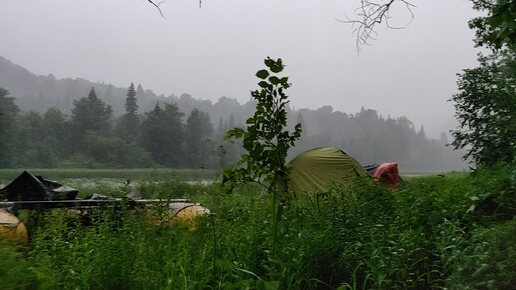 Сплав по реке Зилим . Вторая стоянка , дождик накрыл на стоянки , почти успели разложится