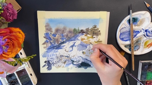 Рисуем весенний пейзаж акварелью. Скетч с рекой