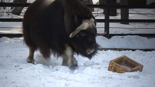 Пугачев разбушевался! Овцебык по имени Пугачев бодается с деревянным ящиком.