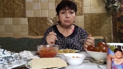 Мукбанг. Макароны по флотски, помидоры консервированные и лечо ( домашние ), хлебцы с маслом и икрой, чай. 😋👍