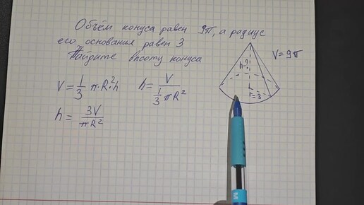Задача на ВПР, ОГЭ или ЕГЭ. Объём конуса равен 9 пи а радиус его основания равен 3