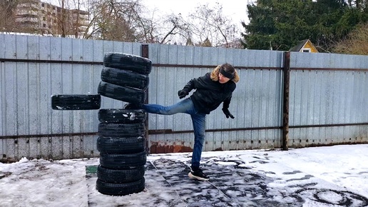 Удары ногами и руками в полную силу. Выбить подряд несколько шин. Мой метод тренировок - 11.