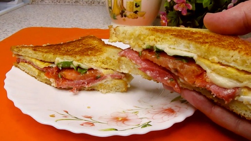 Идеальный завтрак за считанные минуты. Горячий бутерброд (сэндвич) с омлетом, с сытной начинкой. На сковороде готовим, очень вкусно и сытно.
