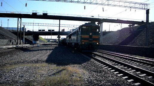 Далее: Тепловоз 2ТЭ116-1001 с составом из фитинговых платформ.