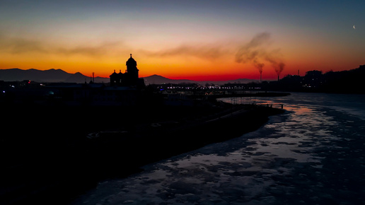 рассвет Набережная озера Солёное и церковь, гора Сестра и залив Находка