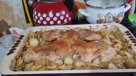 Зажариваю курицу и картофель в вкуснейшем соусе, в духовке.Молочная лапша.