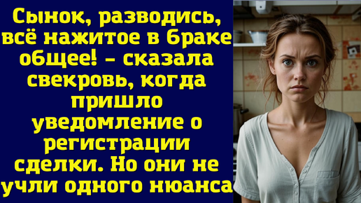 Сынок, разводись, всё нажитое в браке – общее – сказала свекровь, когда пришло уведомление о регистрации сделки