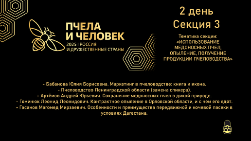 Пчела и Человек 2025. 3 секция. Докладчики: Бабанова, Пчеловод ЛО, Артёмов, Гоминюк, Гасанов
