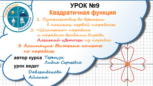 Урок 9. Исторические сведения о параболе. Уравнение параболы. Аленький цветочек из парабол. Анимация движения кометы по параболе.