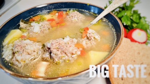 А я думал такой суп умеет готовить каждый! Суп с говяжьими фрикадельками на насыщенном овощном бульоне с зеленью.