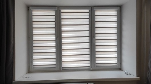 Рулонные шторы UNI 2 с эффектной серой тканью Зебра Лора современная, функциональная и стильная защита оконного проема от солнца.