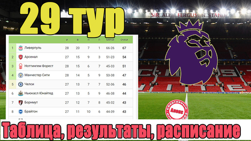 Чемпионат Англии по футболу (АПЛ). Таблица, расписание, результаты. Итоги всего 29 тура.
