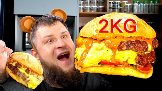 EATING 2 KILOGRAM GIANT BURGER, COOKING AND EATING, ASMR MUKBANG, АСМР МУКБАНГ, 먹방, 大食い, たべる, 谢尔盖