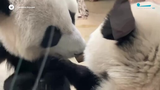 панда Катюша спокойно жевала росток, но мама Диндин захотела тоже сладкую вкусняшку и отобрала у дочери