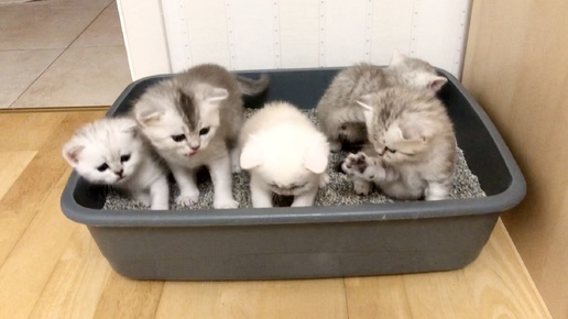 Котятам кошки Кайли 28 дней. Осваиваем лоток. Общая заинтересованность.
