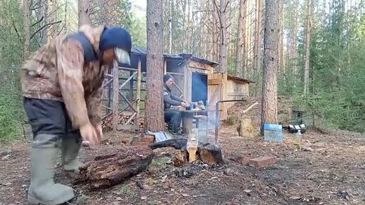 Уоу! Отлично устроились! Рыбалка донками. Готовим МЯСО на углях с гарниром. Живём в лесу. Налим.
