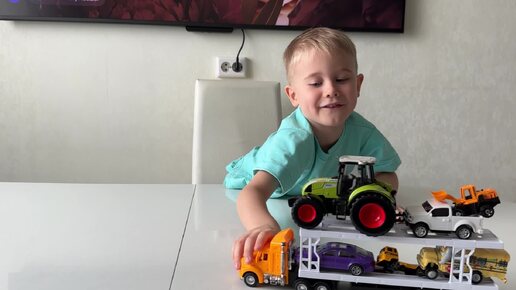Жёлтый экскаватор Брудер ( Bruder ) и автовоз