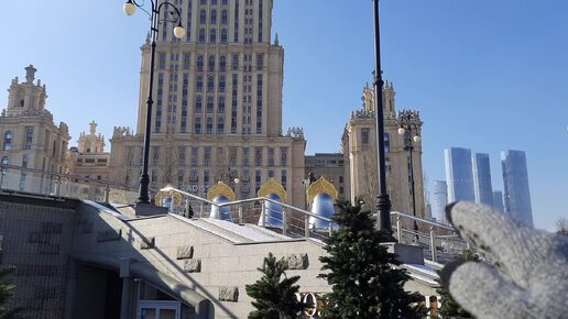 Пальмы и матрёшки возле одной из Сталинской высоток на набережной Шевченко в Москве