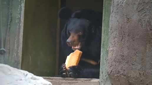 Гималайская медведица Челси аппетитно позавтракала и пошла искать вкусные корешки под гамаком.