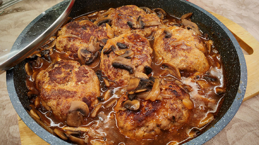 Говяжьи котлеты с грибным соусом на сковороде.