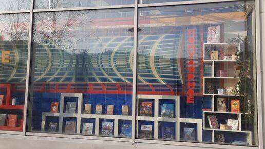 У дома Книги "Молодая гвардия". Витрина с арт композициями из пластиковых коробок. Успенская церковь на Большой Полянке в Москве
