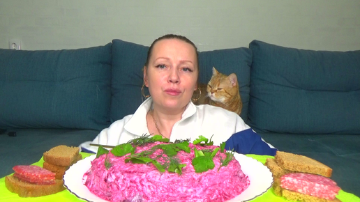 Мукбанг королева моего стола Селедка под шубой, хлебушек с колбасой. еда.