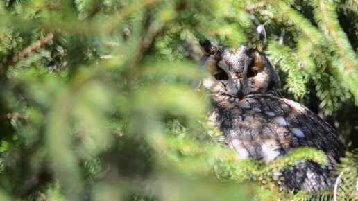 Ушастая сова и совята на елке