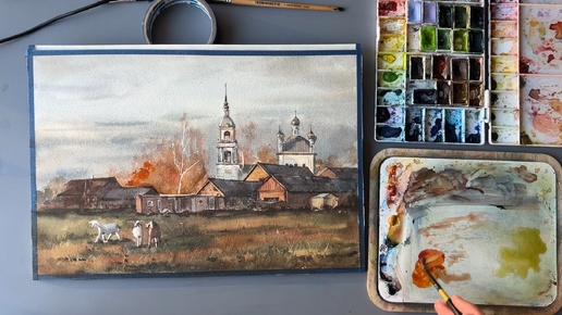 Осень в деревне. Акварельный пейзаж. Процесс рисования.