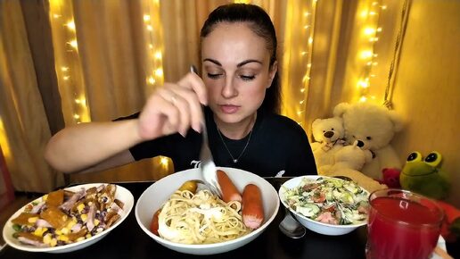 Мукбанг🍝Сардельки с макаронами, салат с фасолью и колбасой, овощной салат🥗🌶️🫘 Болталка ☺️