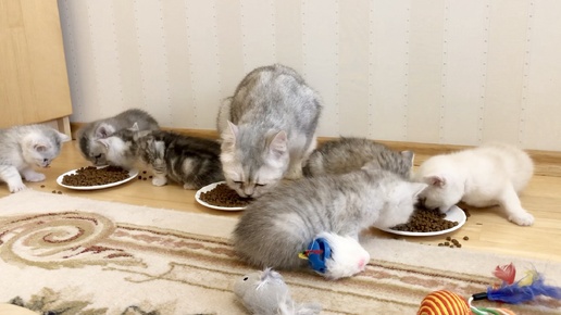 Котятам кошки Кайли 1 месяц. Малыши первый раз пробуют сухой корм для котят.