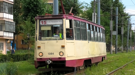 Трамвай Челябинска 71-605А №1384 маршрут 15 следует по проспекту Ленина