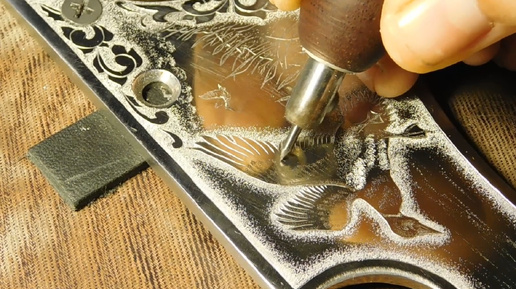 Гравировка рисунка вручную на металле, накладка на арбалет. Гравировка пневмоштихелем по нержавейке. Финальная часть проекта.