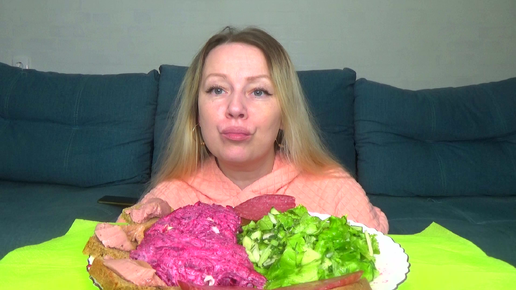 Мукбанг селедка под шубой, очень зеленый салатик. Еда.