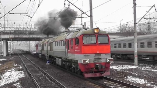 Тепловоз 2М62У-0085 с платформами для перевозки контейнеров и ЧМЭ3Э-6229 с пассажирскими вагонами.