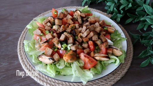 Салат с мидиями, помидором и сухариками