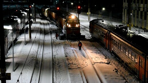 Снегоуборочный поезд ПСС1К-038. Работа по очистке от снега станции.