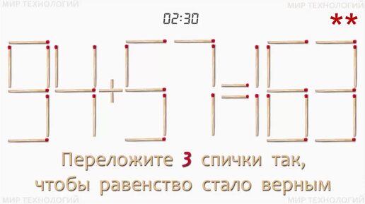 Задача со спичками 450 (3). Переложите 3 спички так, чтобы равенство стало верным (94+57=163).