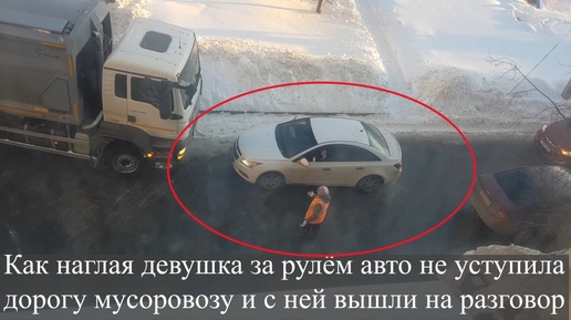 Как наглая девушка за рулём авто не уступила дорогу мусоровозу и с ней вышли на разговор