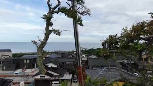 Япония. Как спилить большое ветвистое дерево на территории храма. Работа бензопилами HUSQVARNA и крана.